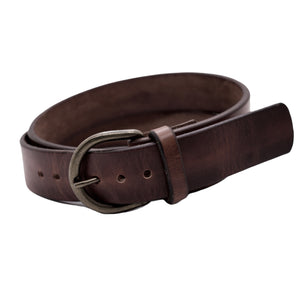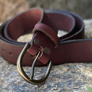 The BROOKE is a 1.5 inch All American women's medium brown leather belt that we  hand make in our Arizona Workshop. Buckle options include aged steel or aged brass and leather colors include dark brown and black as well as . Our buckles have a rounded and softer ladies design. We use 21 steps to craft this belt from vegetable tanned top grain American leather. Feel confident that it is made to last a very long time. Accessorize this medium brown leather belt with denim jeans or summer shorts. Because it is so difficult to find well made leather belts for women, many have chosen to purchase The BROOKE so that they can own a real one piece leather belt capable of lasting a long time.