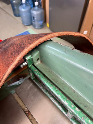 November 2021 at a Tannery in St. Louis, I gave away some of my wife’s week old fresh Tree House holiday IPAs to get my hands on just 5 crown choice steer hides of this once a year autumn tannery single batch run. As the story goes… the first drum load was produced a long time ago by accident. As early fall temperatures ushered in cooler conditions in the rooms with the seeping pools, this leather took on a darker and more firm characteristics than the usual bark tanned hides. The master tanners of the time missed the subtle overnight climate swings and thus were baffled. Failing to accommodate for this variable, a deeper pale and more rigid batch was produced and then vanished in the subsequent batches, not able to be fully replicated again until...the next Autumn. As legend has it, the leather was referred the “ghost in the oak swamp” due to the event coinciding late October and Halloween most years. The feedback on this unique and extra firm leather from saddlemakers added legend to their already popular and strong harness leather. A few years later, a savvy master tanner Stayed through the night and caught on to what was subtly happening after everyone left the tannery. Today, one single customary drum load is quietly produced late September-early October every year.