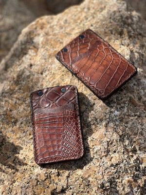 At Scottsdale Belt Co. we've found a way to legally and ethically create handmade exotic leather bracelets and minimalist wallets of incredible beauty and sustainable luxury. In the past, the two big European fashion design houses monopolized these exclusive hides through limited supply. It ensured that these kinds of leathers were not available to small manufacturers. In other words, the $5000 handbags and the $900 wallets made from authentic and sustainable exotics could not be found anywhere for less. In recent years; however, large increases to Alligator populations in Florida and Louisiana have allowed us to source exotic hides domestically that are tagged, and do not leave the United States. With this advantage and because we craft our own unique leather designs, we have created an affordable collection of wild and exotic leather goods from Alligator, lizard, ostrich, snakeskin, and shark in an honest and legal way.Each wallet is meticulously cut, glued, skived, beveled and edged to create an heirloom quality minimalist wallet that allows customers to organize credit cards and money in a beautiful, one of a kind, handcrafted designs as well honor nature at the same time.