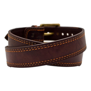 Just like the season, The AUTUMN is among one of the favorites for our returning customers. Hand-cut and American Made with threads of nutmeg and orange on premium Merlot bridle leather, the distinct look of the Autumn is always a head turner. Stainless steel and solid brass are available buckle choices, but solid brass is more popular with the color combination.